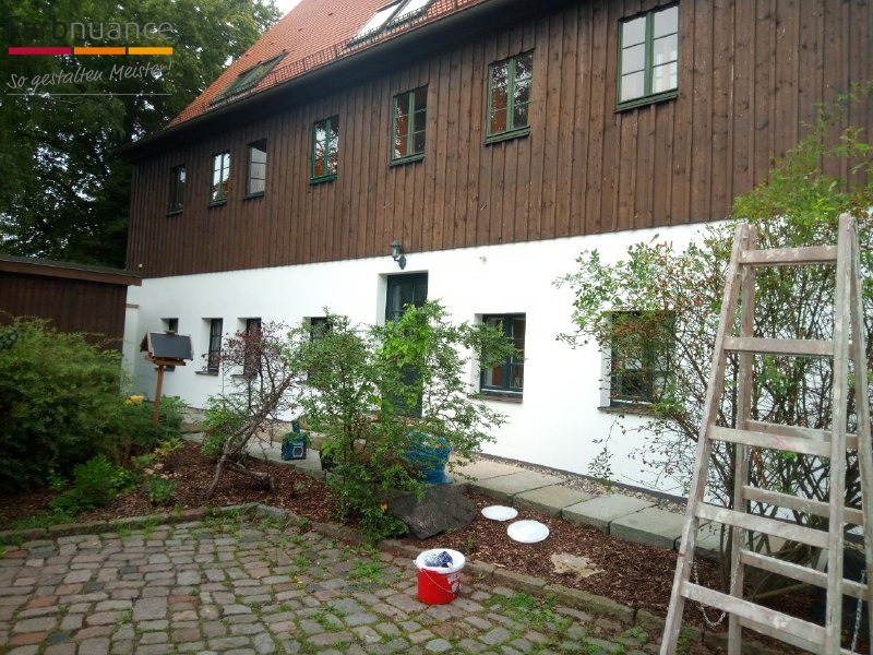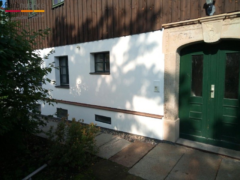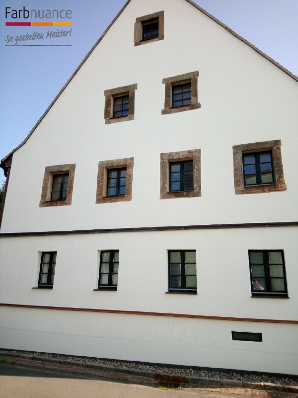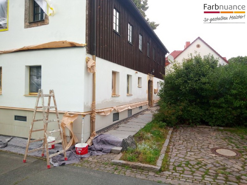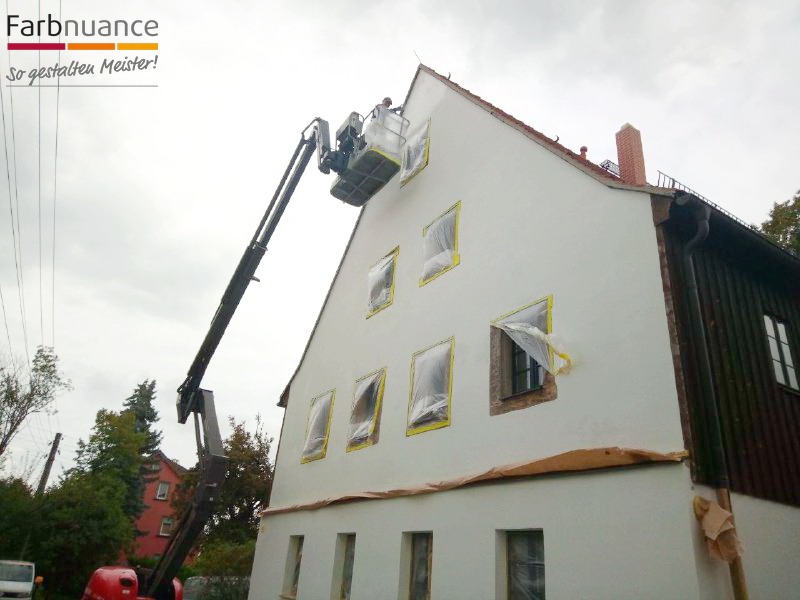 Nach sorgfältigem Abkleben dieses historischen Mehrfamilienhauses begann unsere Partnerfirma „Algenmax Sachsen-Thüringen eG“ mit der Vorwäsche der Fassade. Für den Fassadenanstrich benutzten wir diesmal unseren Hubsteiger nach einem Neuputz. Dabei verwendeten wir eine hochwertige Fassadenfarbe von Keim.